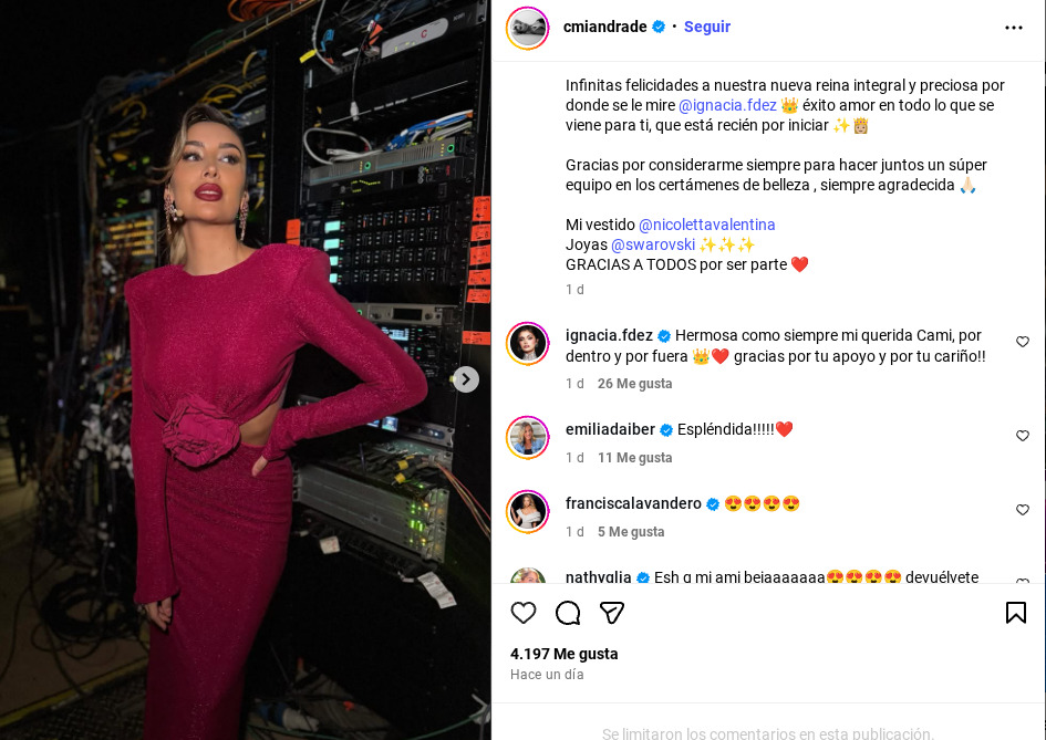 A su vez, Ignacia comentó la publicación con otro gesto de cercanía. “Hermosa como siempre, mi querida Cami, por dentro y por fuera. ¡Gracias por tu apoyo y por tu cariño!”, escribió.