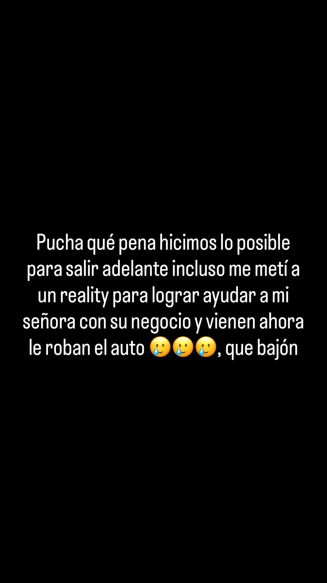 "Pucha qué pena, hicimos lo posible para salir adelante, incluso me metí a un reality para lograr ayudar a mi señora con su negocio y vienen y ahora le roban el auto. Qué bajón", manifestó.