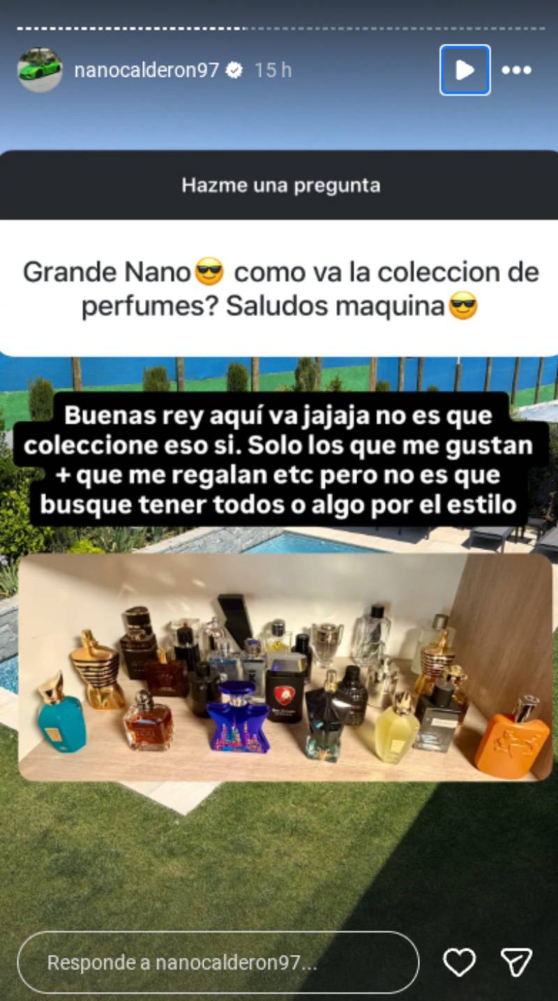"No es que coleccione eso (perfumes)", escribió Nano Calderón destacando que solo conserva los que realmente le gustan o ha recibido como regalo. "No es que busque tener todos o algo por el estilo", añadió.