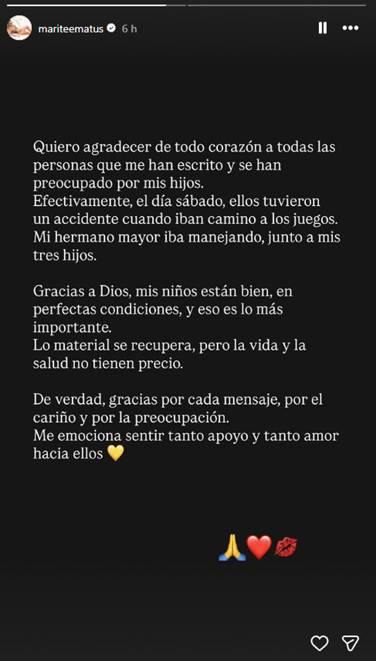 "Quiero agradecer de todo corazón a todas las personas que me han escrito y se han preocupado por mis hijos. Efectivamente, el día sábado, ellos tuvieron un accidente cuando iban camino a los juegos", comenzó diciendo en un comunicado compartido en las historias de su cuenta de Instagram.