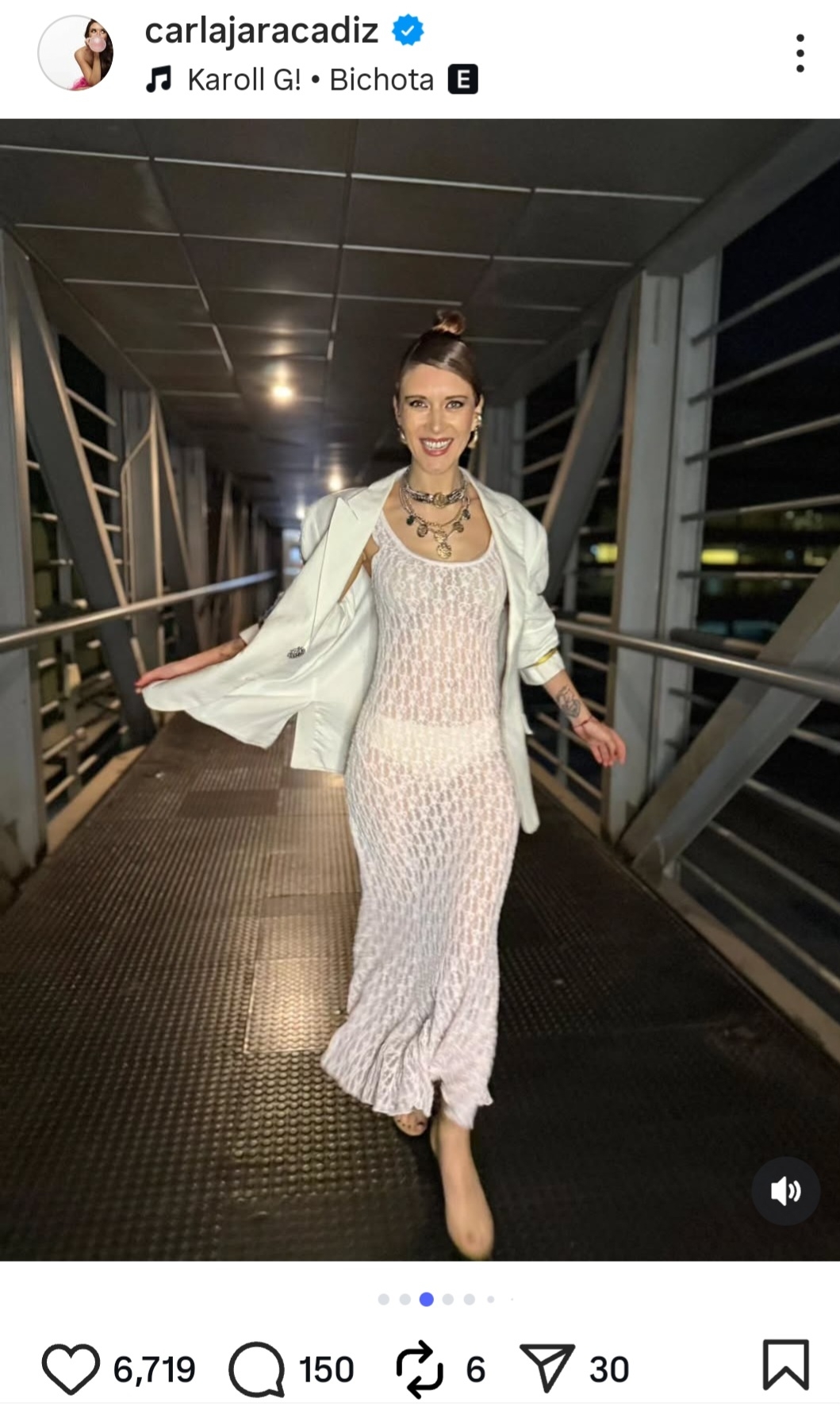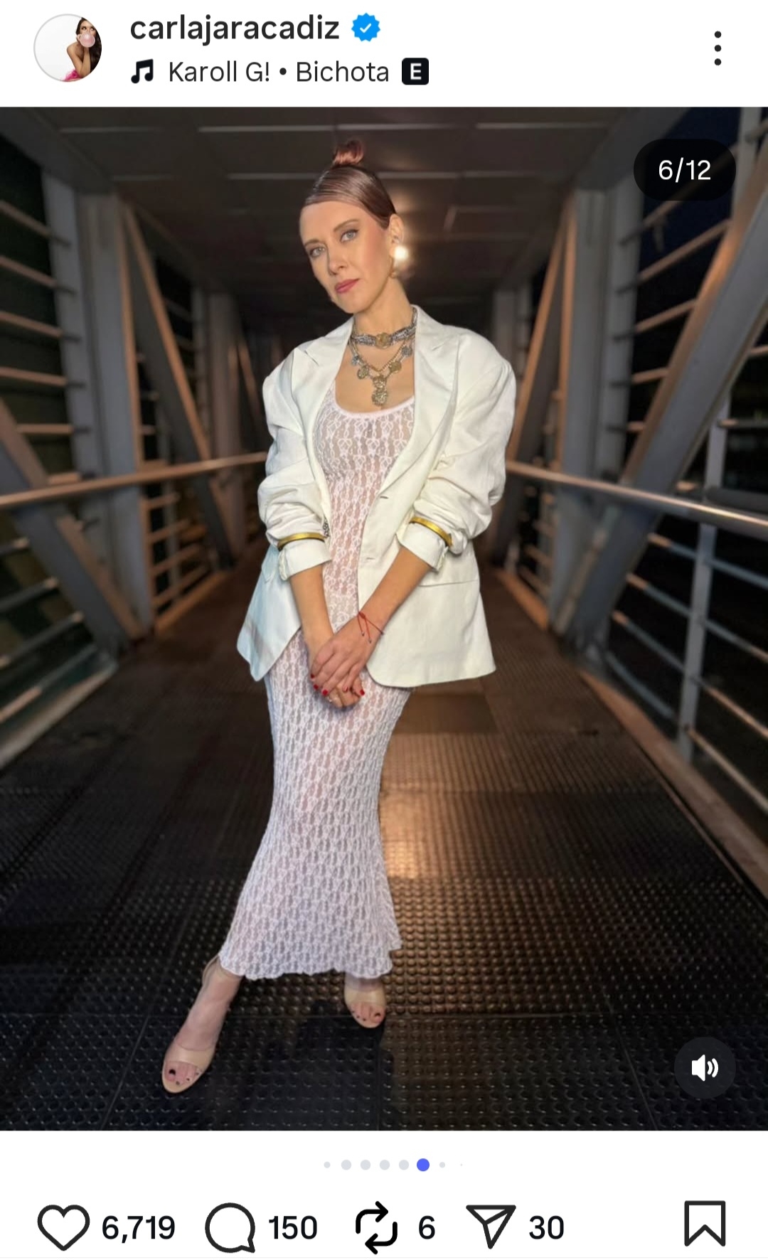Carla Jara lució elegante gracias a un vestido midi de encaje en transparencia. Y mezcló la sensualidad de esta prenda junto a la sofisticación de un blazer bien estructurado.
