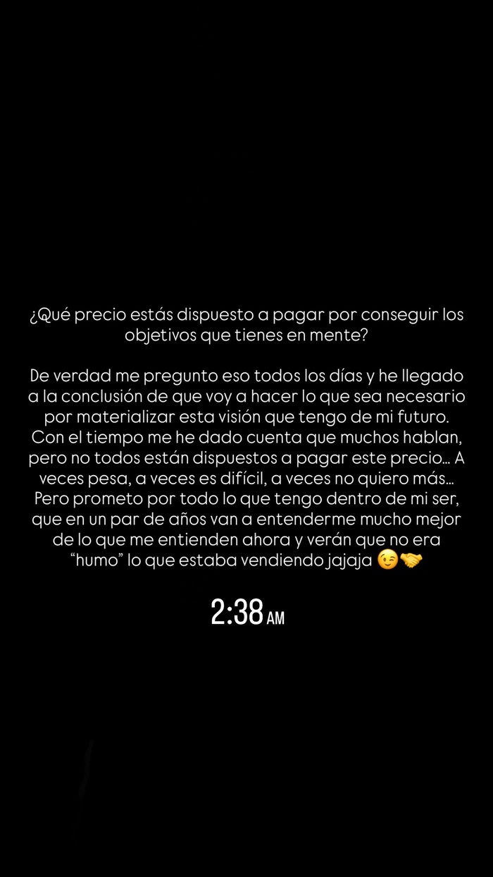 Ir a la siguiente nota“Pero prometo por todo lo que tengo dentro de mi ser, que en un par de años van a entenderme mucho mejor de lo que me entienden ahora y verán que no era ‘humo’ lo que estaba vendiendo jajaja”, finalizó sus palabras, sin ahondar más al respecto.