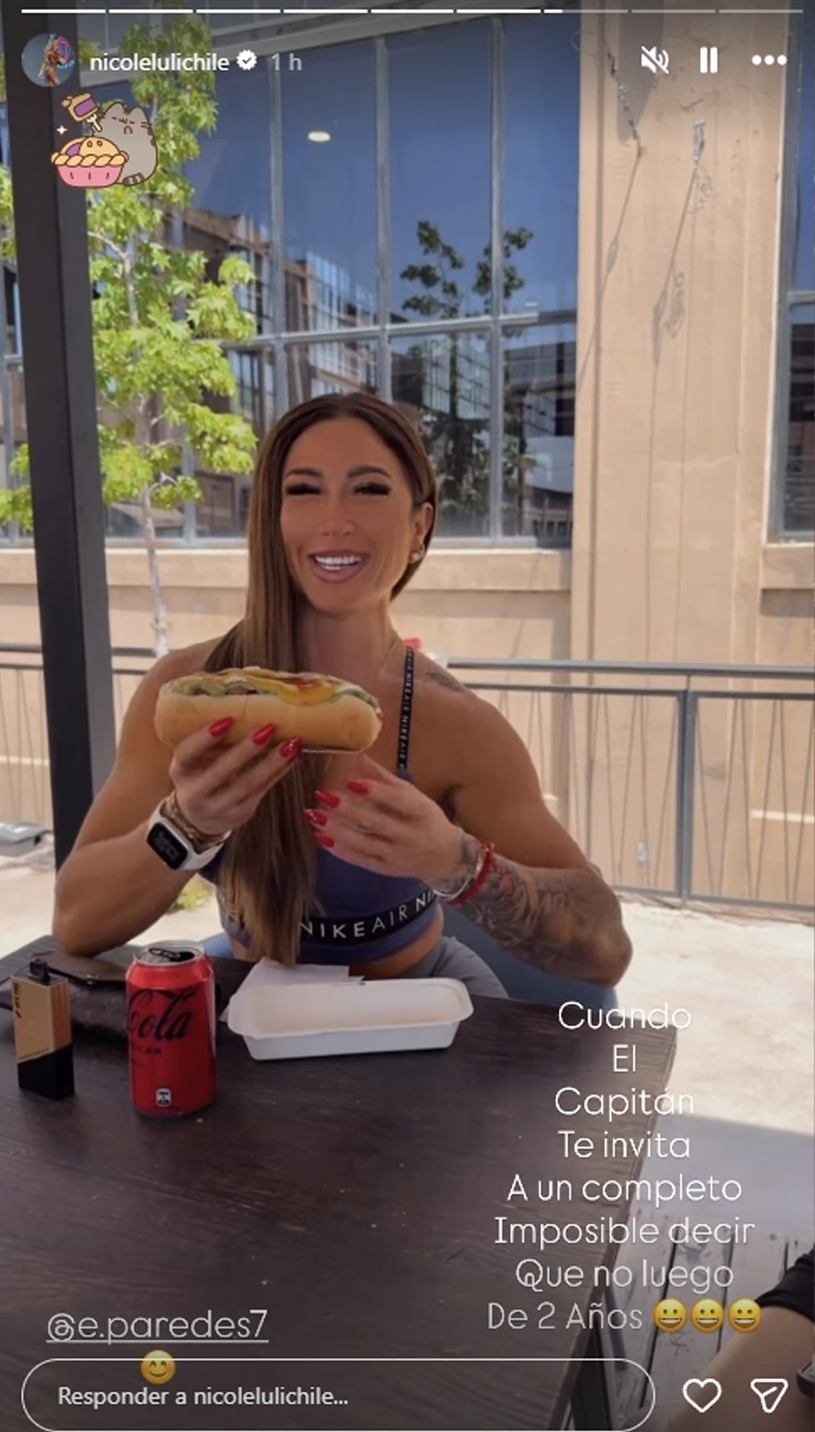 En el video publicado en sus historias, se puede observar sosteniendo un completo italiano en sus manos, mientras las personas que están junto a ella se ríen, como el exfutbolista Esteban Paredes.