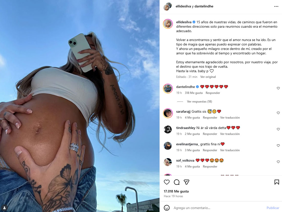 "15 años de nuestras vidas, de caminos que fueron en diferentes direcciones solo para reunirnos cuando era el momento adecuado. (...) Y ahora un pequeño milagro crece dentro de mí, creado por el amor que ha sobrevivido al tiempo y encontrado un hogar", escribió ella.