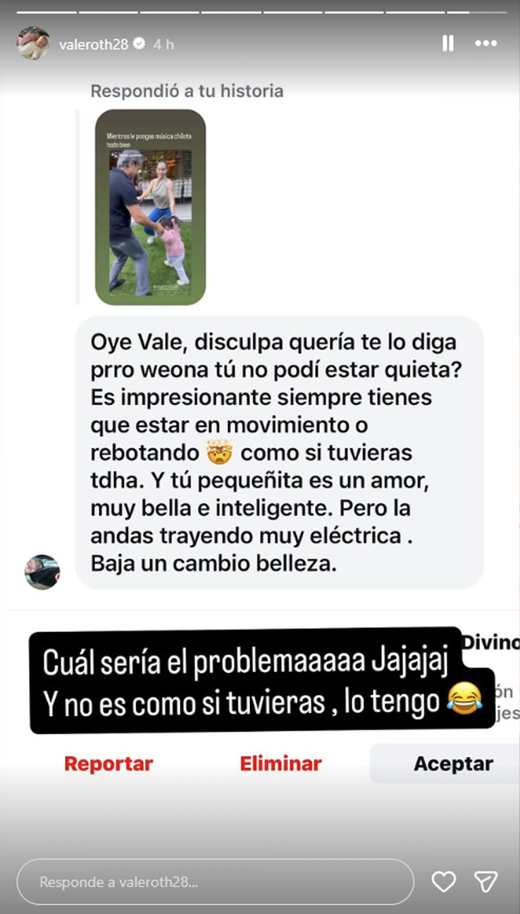 "Oye, Vale. Disculpa que te lo diga pero, ¿hue… tú no podí estar quieta? Es impresionante, siempre tienes que estar en movimiento o rebotando, como si tuvieras TDAH (Trastorno de déficit de atención con hiperactividad)”, escribió la mujer, tal como lo hizo ver Roth.