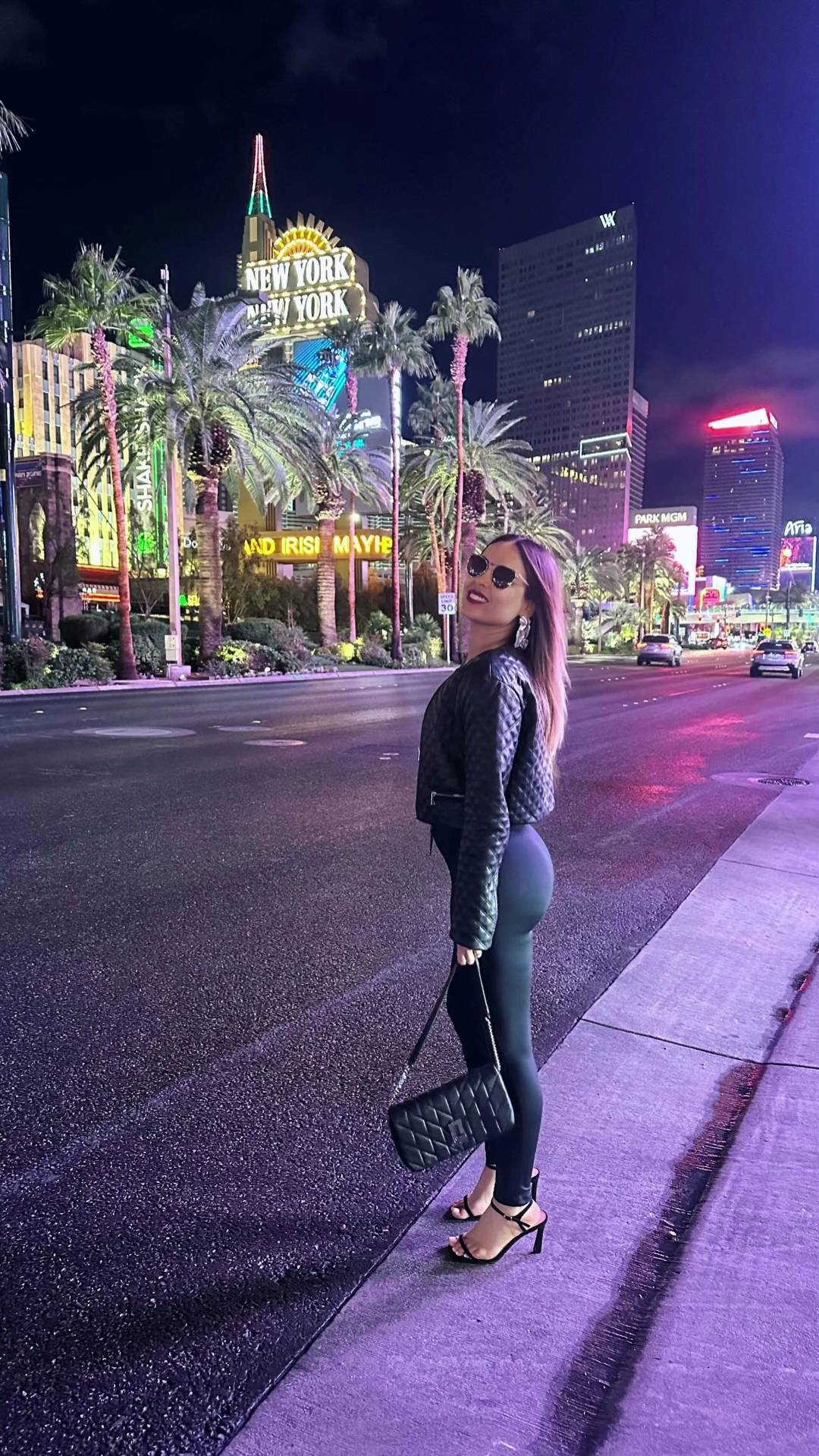 Este atuendo lo complementó con sandalias de tacón fino, lentes oscuros, bolso negro con diseño similar al de su chaqueta y unos maxiaros plateados, que reflejaron todo el brillo neón de la ciudad.