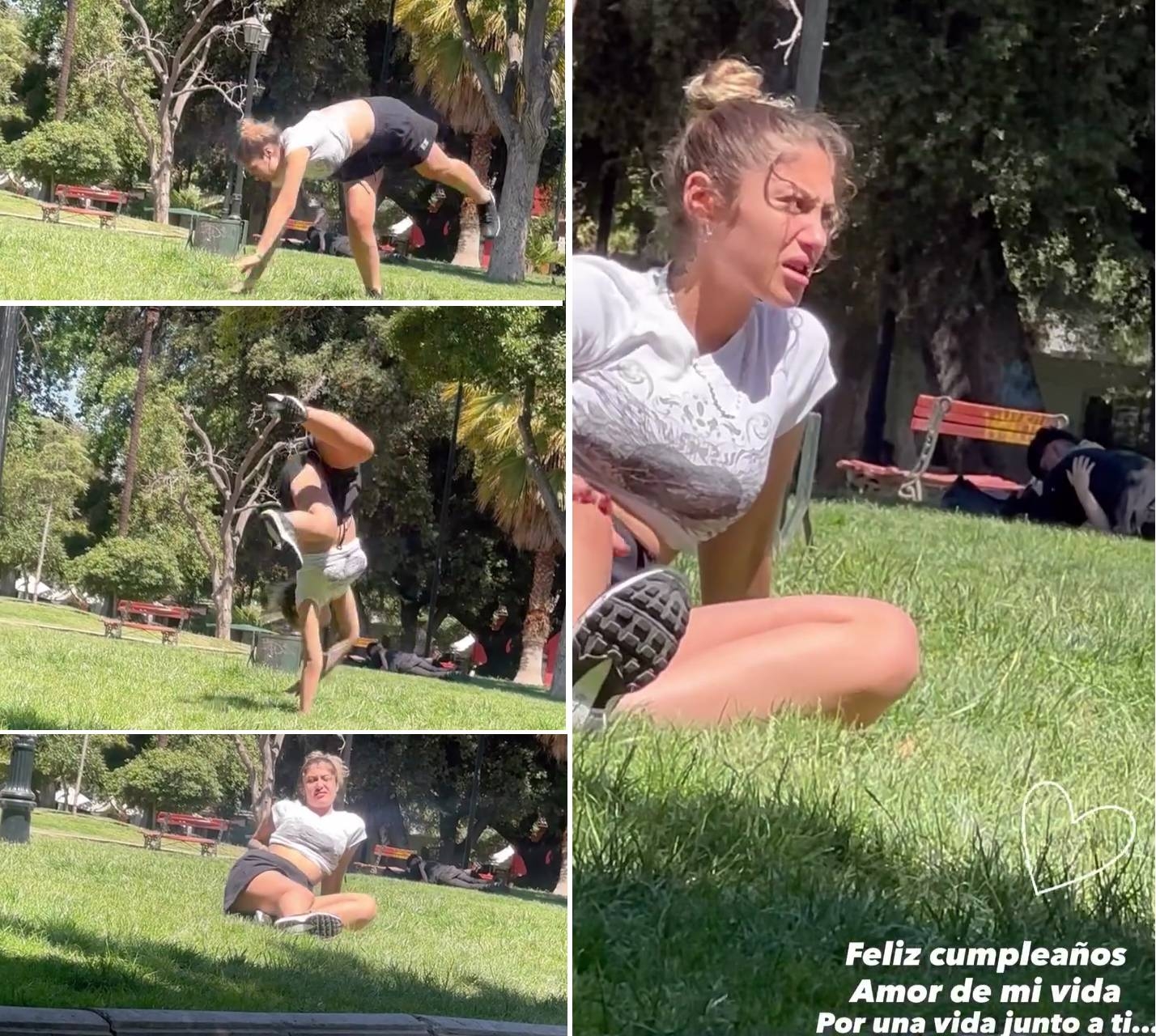 La hija de Pame Díaz no logra su cometido, y queda tumbada sobre la grama, con expresión de malestar en su rostro. En el fondo se escucha al pololo burlarse tiernamente de la joven, a la vez que hace un close up de su cara. "Feliz cumpleaños, amor de mi vida. Por una vida junto a ti", escribió el cantante en su publicación.