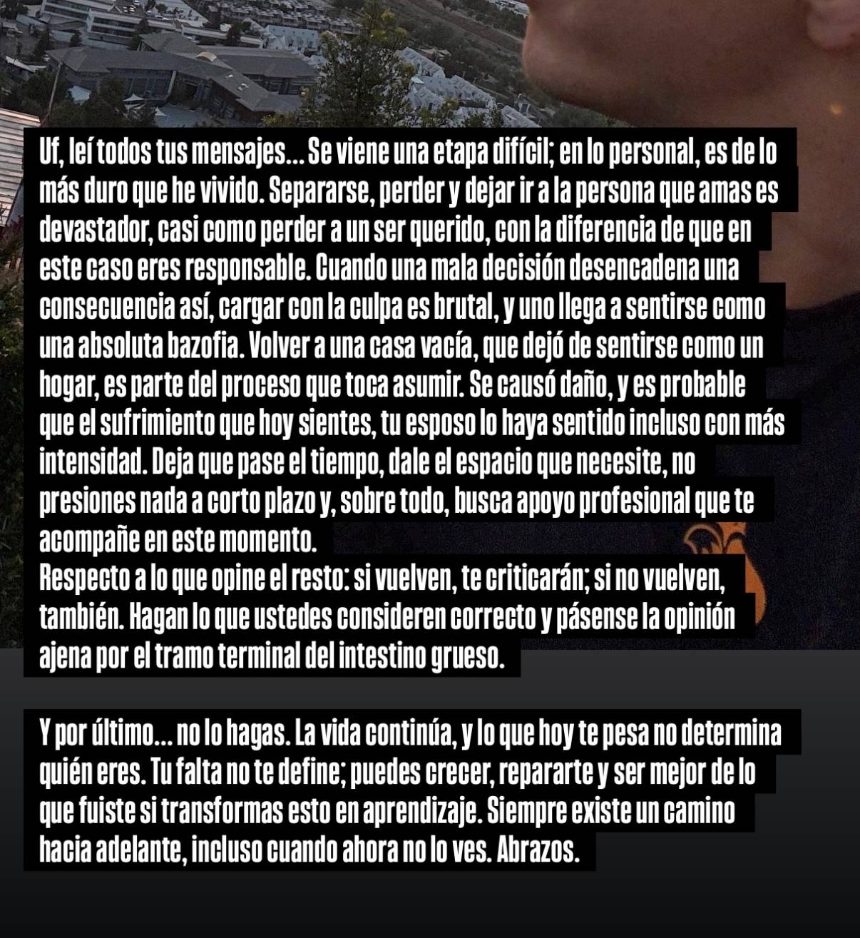 El presentador le advirtió que le tocará enfrentar una de las etapas más duras de su vida. "Separarse, perder y dejar ir a la persona que amas, es devastador", dijo. "Cuando una mala decisión desencadena una consecuencia así, cargar con la culpa es brutal y uno llega a sentirse como una absoluta bazofia", confesó.