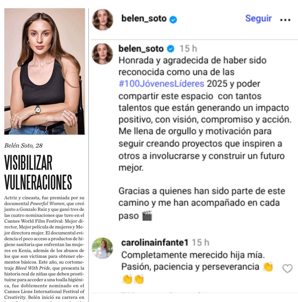 "Honrada y agradecida de haber sido reconocida como una de las 100 Jóvenes Líderes 2025 y poder compartir este espacio con tantos talentos que están generando un impacto positivo, con visión, compromiso y acción", escribió Soto en un post de Instagram.