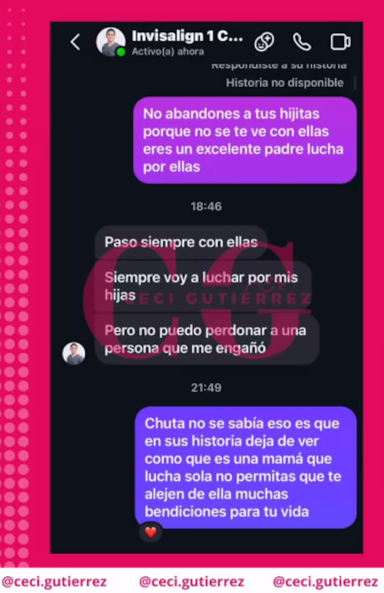 La periodista Cecilia Gutiérrez reveló capturas de pantalla de una conversación del odontólogo con una seguidora. En el chat, ella le habría pedido velar por las dos hijas que tiene con la bailarina.