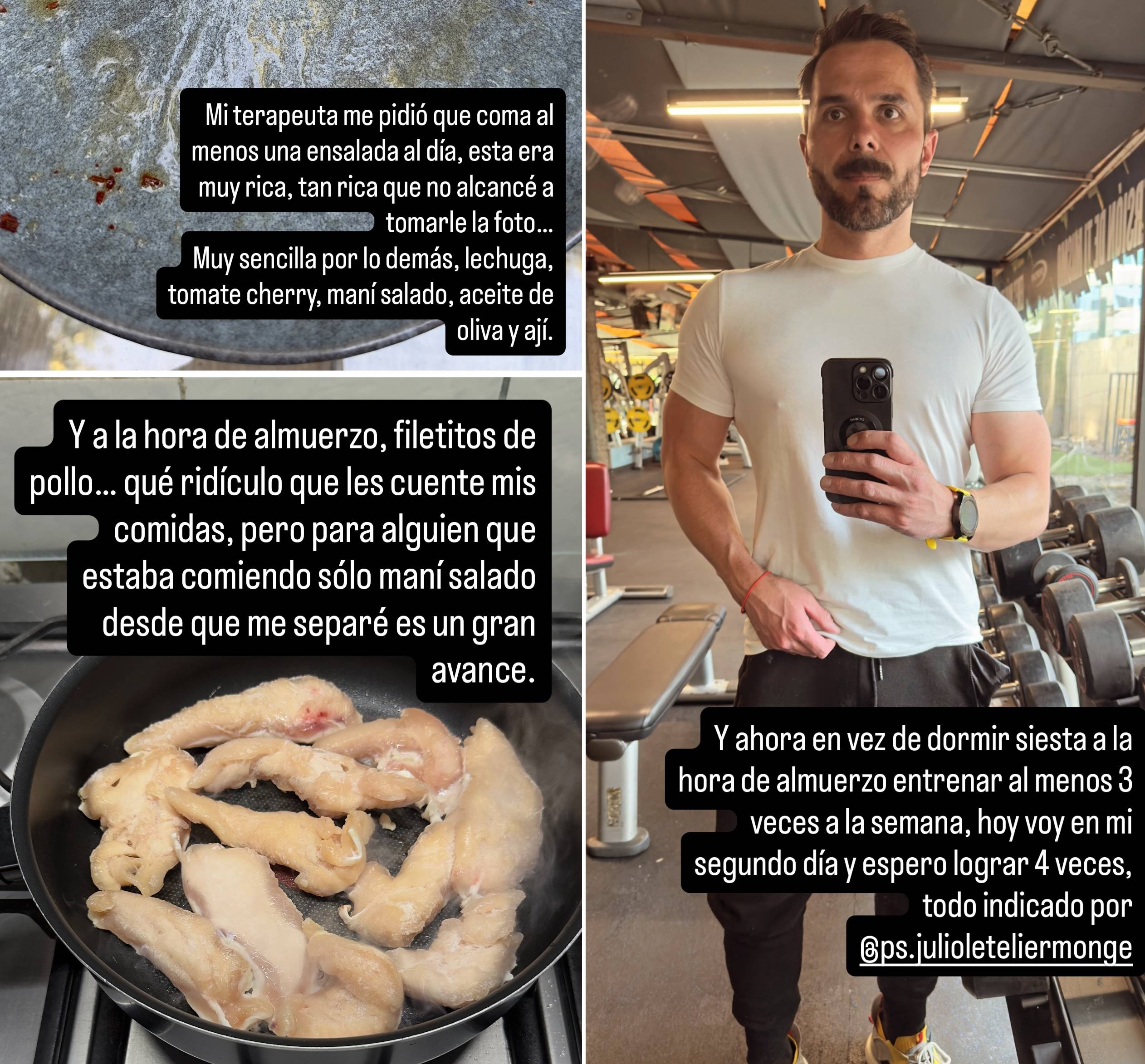 "Y a la hora del almuerzo, filetito de pollo. Qué ridículo que les cuente mis comidas, pero para alguien que estaba comiendo solo maní salado desde que me separé, es un gran avance", expresó. "Ahora en vez de dormir siesta a la hora del almuerzo, entrenar al menos tres veces a la semana", agregó.