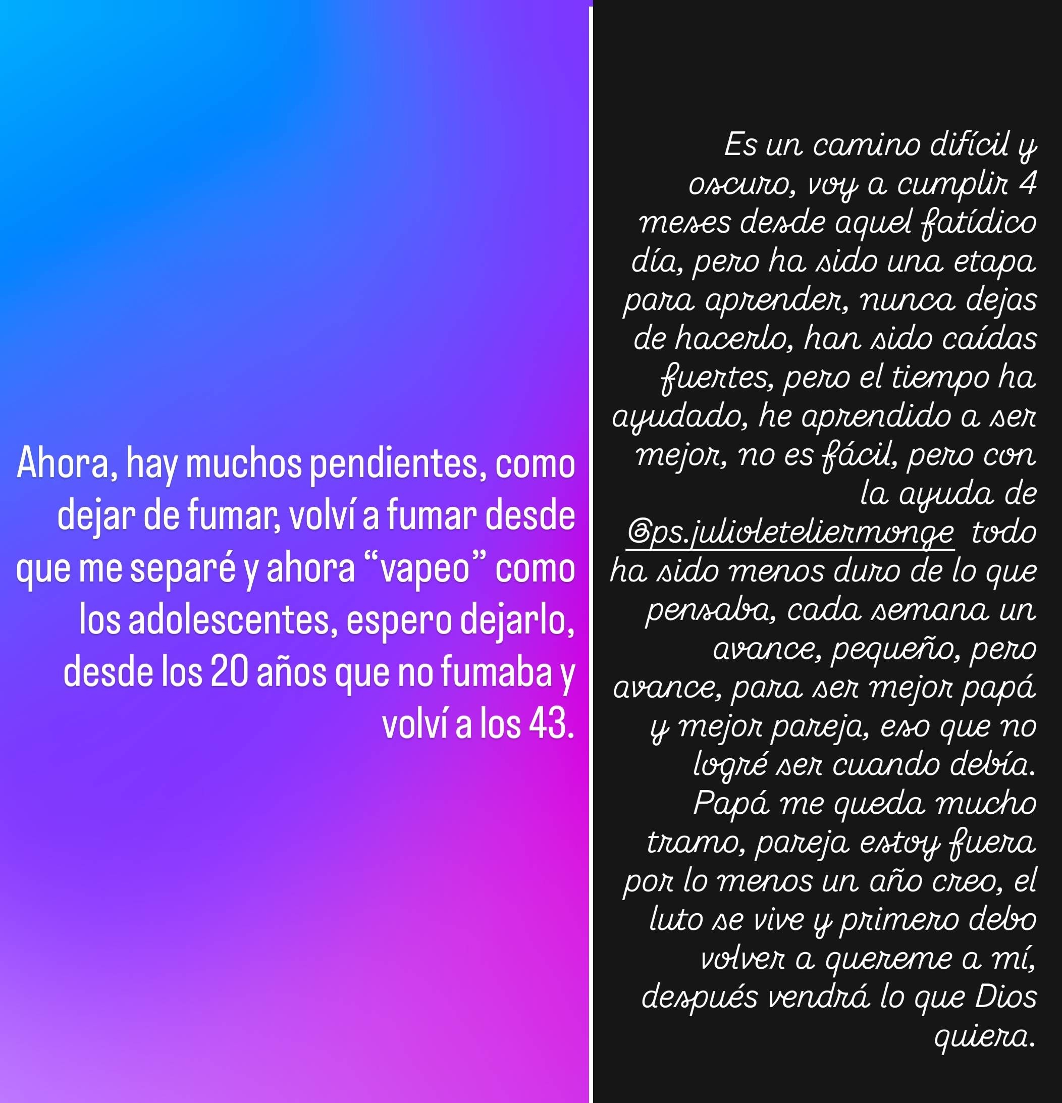 El empresario y exchico reality se sinceró con sus seguidores de Instagram, a quienes confesó que luego de separarse de la madre de sus cuatro hijos, retomó el hábito del cigarrillo y perdió el apetito. Sin embargo, su vida está tomando poco a poco un mejor rumbo, con la guía del psicólogo Julio Letelier Monge.
