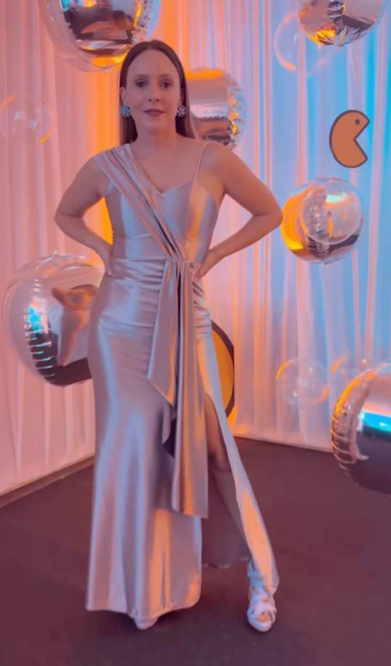 En la imagen, Maly luce un elegante vestido plateado de satén y tirantes delgados. La pieza tiene una apertura lateral y una banda de tela que cae por el frente de su cuerpo, creando un dramático efecto de cascada.