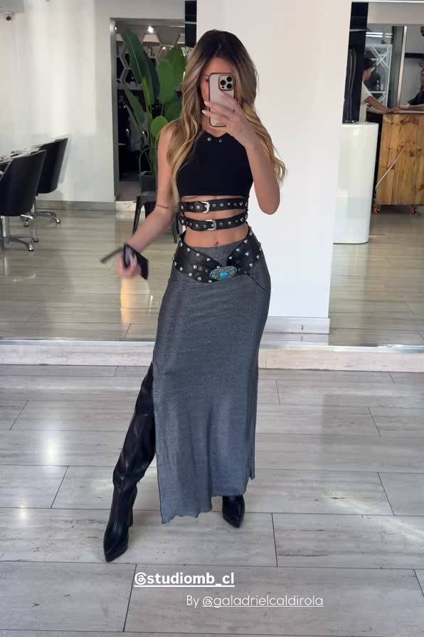 En las imágenes, Gala luce una falda larga plateada con una abertura lateral y un top negro cut out con tres cinturones ajustables. El conjunto resalta su figura y transmite una mezcla perfecta entre fuerza y feminidad.