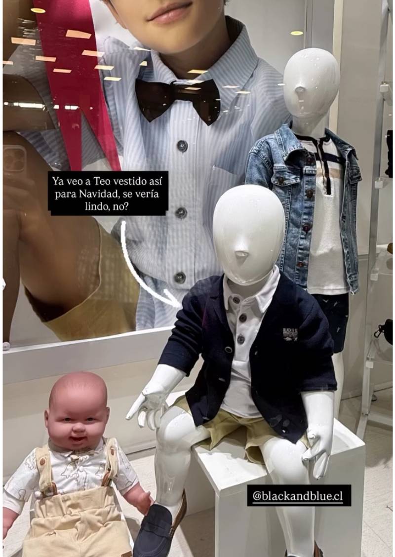 "Ya veo a Teo vestido así para Navidad. ¿Se vería lindo, no?", escribió la influencer en sus historias de Instagram, donde publicó una imagen de una exhibición de ropa infantil en una vitrina.