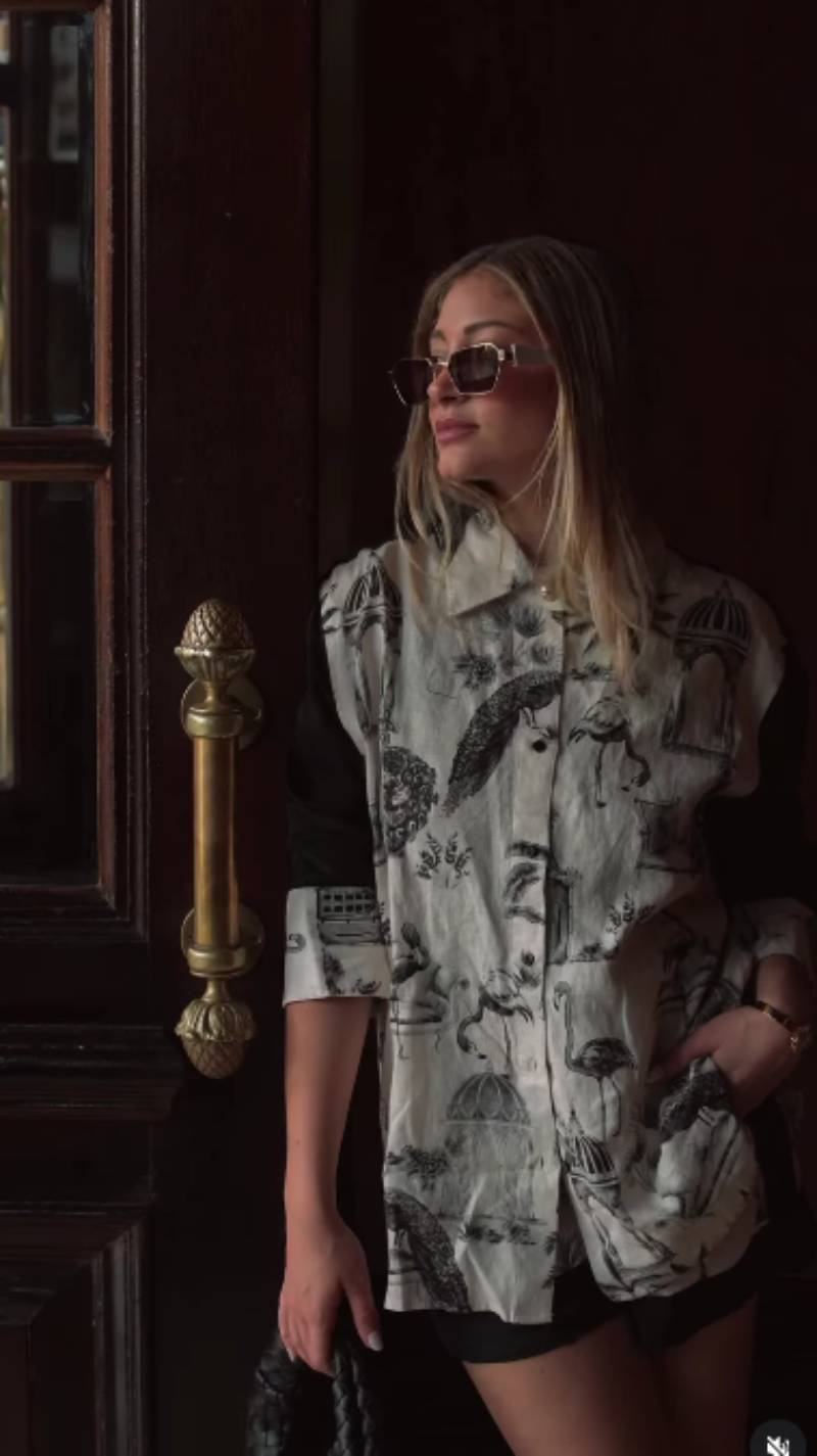 Florencia, por su parte, se inclinó por una camisa oversize de mangas cortas negras y torso blanco con ilustraciones de animales y edificios. Esta pieza la combinó con shorts negros de estilo formal y lentes de sol oscuros que le dieron un toque más sofisticado a su look.