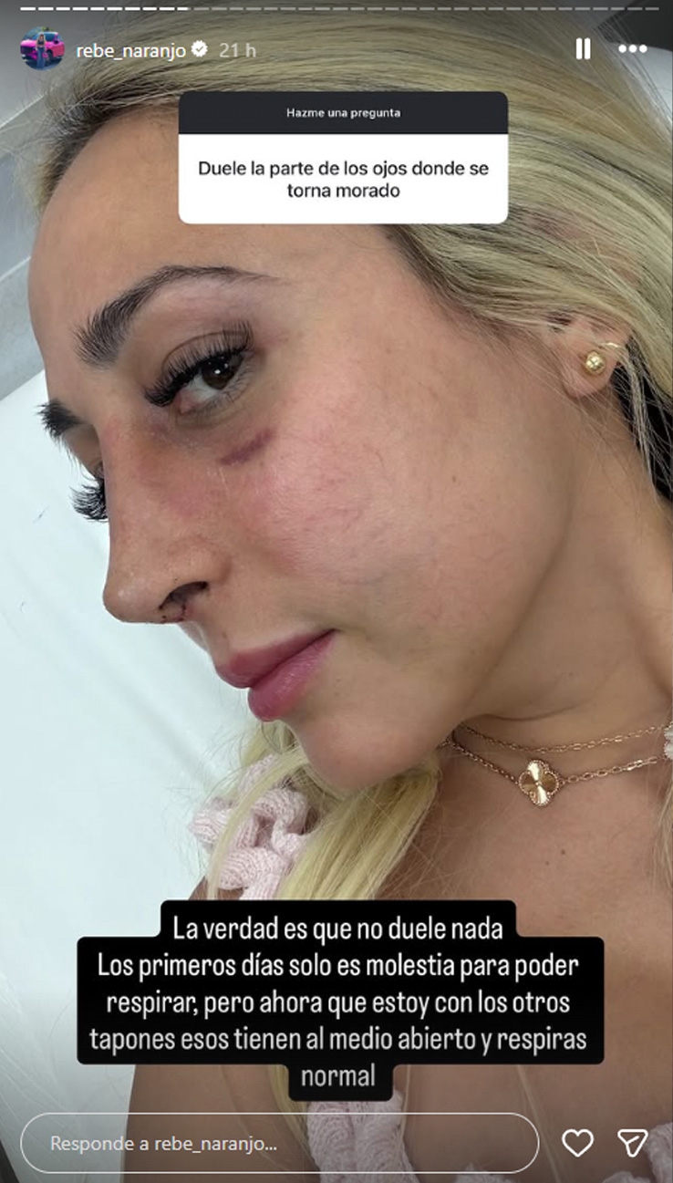 Algunos días atrás, Rebeca compartió las primeras imágenes de la cirugía estética, donde aparecía inflamada, con parchas en la zona y visibles moretones.