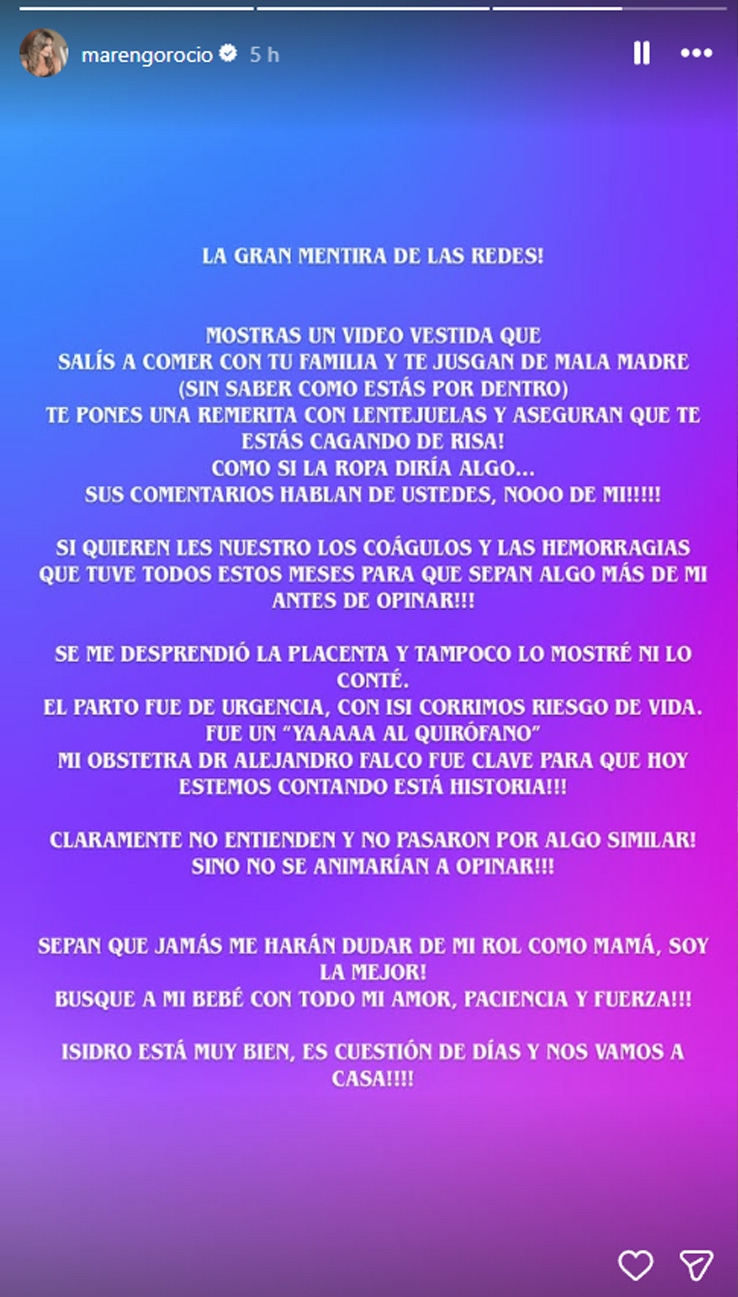 En sus historias de Instagram, la argentina subió un extenso descargo. "La gran mentira de las redes. Mostrás un video diciendo que salís a comer con tu familia y te juzgan de mala madre, sin saber cómo estás por dentro", partió escribiendo.