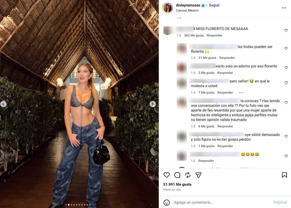 "Miss Florerito de Mesa", fue uno de los mensajes que más reacciones recibió en el post de Instagram. "Exacto, solo un adorno", dijo un usuario. "¿Señor, pero en que le molesta a usted?", replicó una fan. Pero el internauta también recibió una sarcástica respuesta de la influencer.