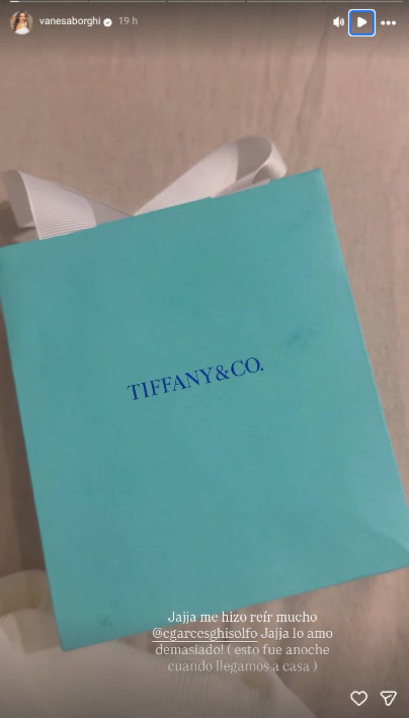 Vanesa publicó en sus historias de Instagram un breve video en el que relató la sorpresa que se llevó cuando encontró una pequeña bolsita de regalo con el logo de la marca de joyas Tiffany & Co. "La estafa máxima. Yo dije, 'ay, amor, para qué gastas'", narró la modelo.