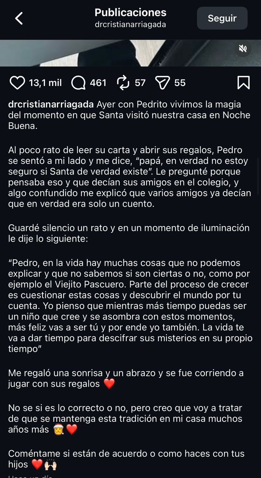 Según relató, luego de abrir los regalos y leer la carta del Viejito Pascuero, el niño se le acercó con una duda sincera: “Papá, en verdad no estoy seguro si Santa de verdad existe”, comentario que surgió tras escuchar a algunos compañeros del colegio que ya cuestionan la tradición.