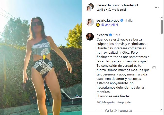 "Cuando se está vacío se busca culpar a los demás y victimizarse. Donde hay intereses comerciales no hay lealtad ni ética. Pero finalmente todos nos sometemos a la verdad y a la conciencia propia. Tu convicción de verdad es tu fuerza, somos muchos más, los que te queremos y apoyamos", partió diciendo Caorsi en una publicación de Rosario en Instagram.