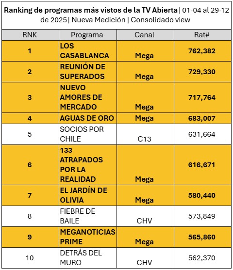 De igual manera Mega se impuso en el antiguo formato de medición de audiencias, que este 2025 tuvo su último periodo de aplicación entre enero y marzo.