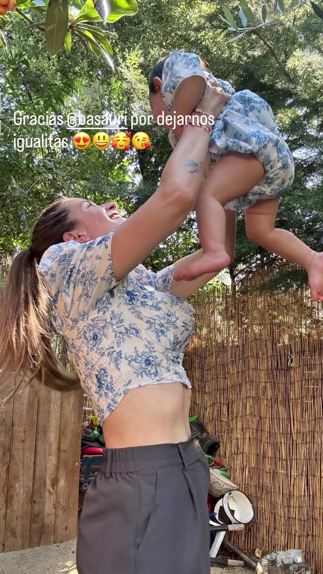 La actriz luce un croptop con un estampado de flores en tonos blancos y celestes, mientras alza a su hija en el aire. En su caso, Mila lleva un body con el mismo estampado.