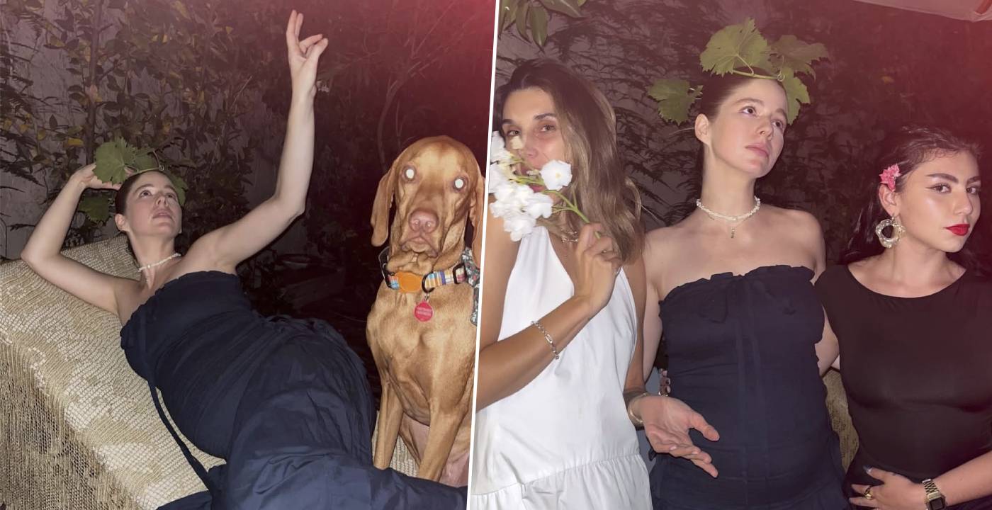 Con dos fotografías de su fiesta de Año Nuevo, la artista mostró su abultado vientre mientras posaba con hojas de parra sobre su cabeza.