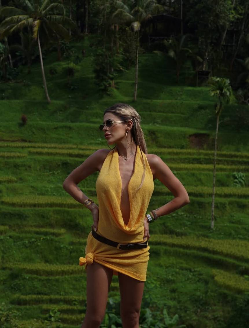 Durante su paseo por los cultivos de arroz de Tegallalang Rice Terrace, Oriana lució un vestido corto, con un pronunciado escote halter y una espalda descubierta que realzó su figura.