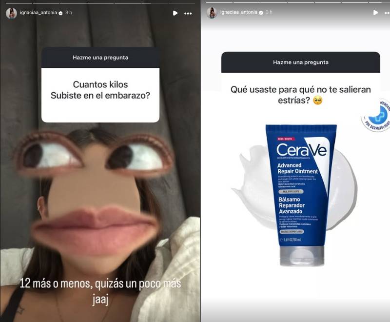 Una de las preguntas que Ignacia Hernández contestó con franqueza y humor, fue cuántos kilos subió durante la gestación. "12, más o menos... quizá un poco más", escribió, entre risas.