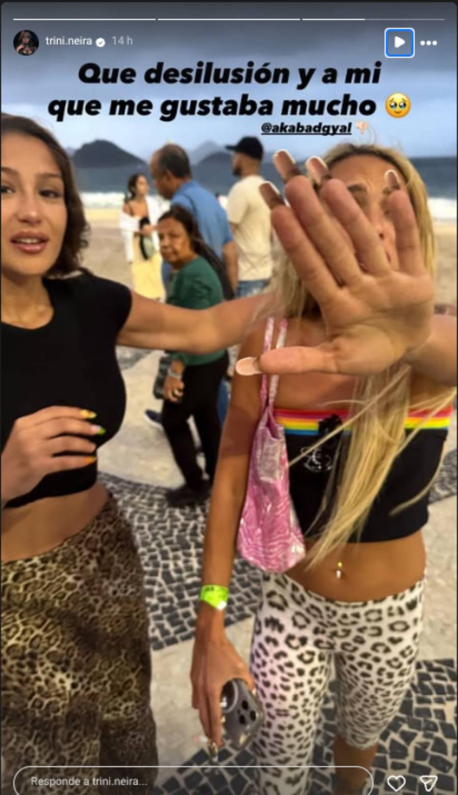 Al igual que Trini Neira, Bad Gyal recibió el año 2026 en Río de Janeiro, desde donde publica imágenes de sus encuentros y fiestas con amigos. Y casualmente, ambas fueron al mismo balneario, tal y como lo captó la hija de Pamela Díaz en una selfie.