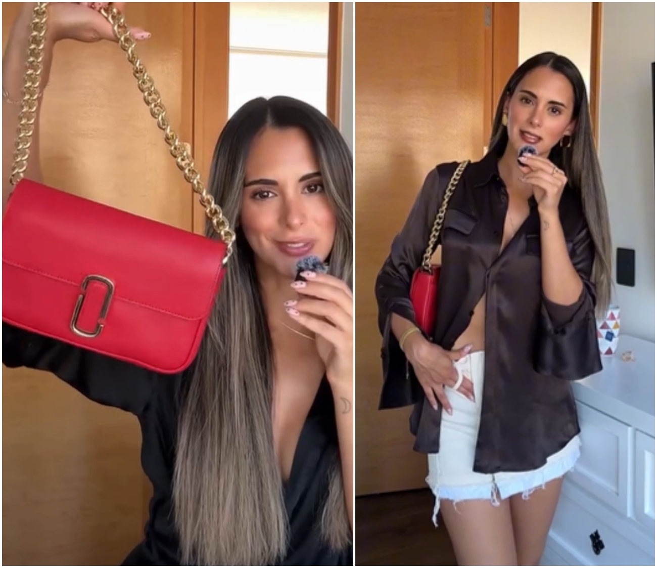 Para la ocasión, la creadora de contenido optó por una camisa satinada color chocolate, shorts blancos de mezclilla desgastada, además de accesorios dorados. Aunque el elemento más destacado fue la cartera que usó.