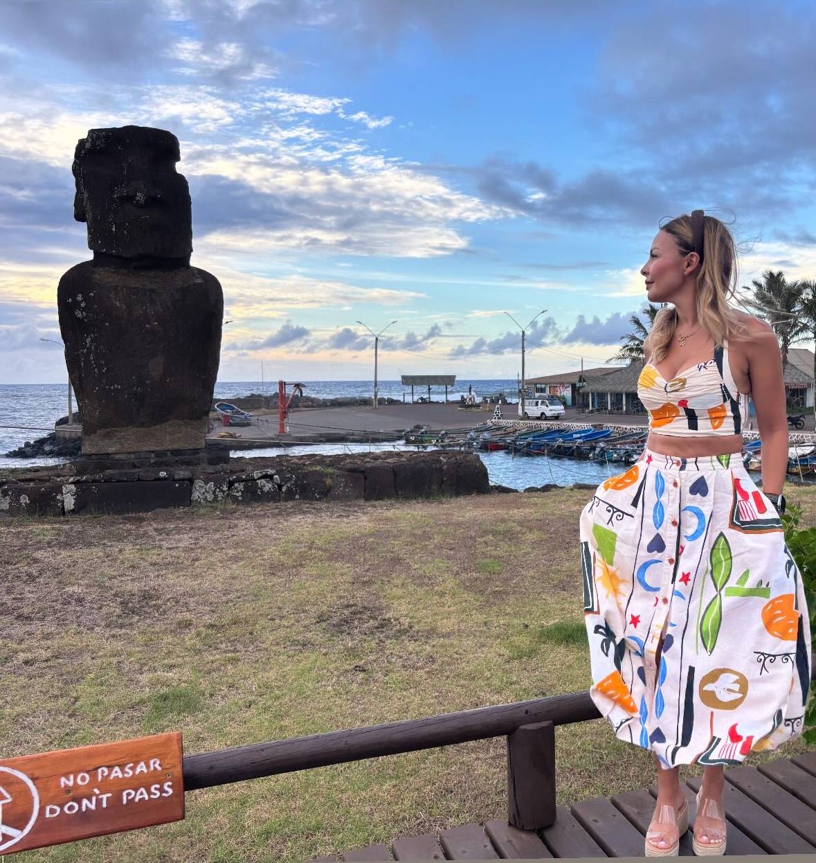 Posteriormente, se la vio posar frente a un Moai con un encantador conjunto, integrado por una maxifalda y un top de escote corazón, ambos en tono blanco y con figuras estampadas en diversos colores.