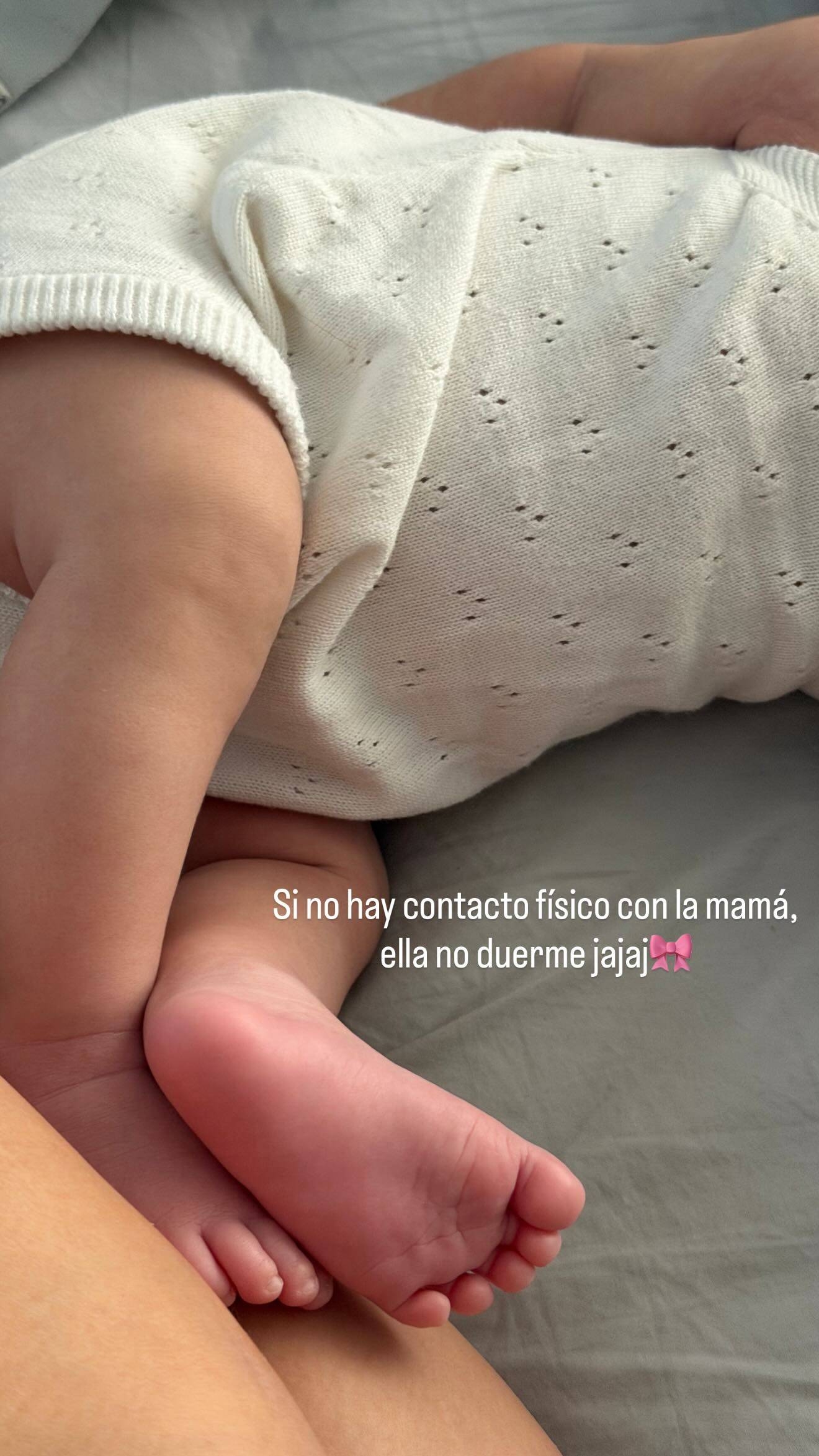 Posteriormente, publicó una mirada más íntima de su vida como joven madre. En esta fotografía, se ven el torso y los piecitos de su guagua tocando las piernas de la influencer, ambas acostadas en una cama.