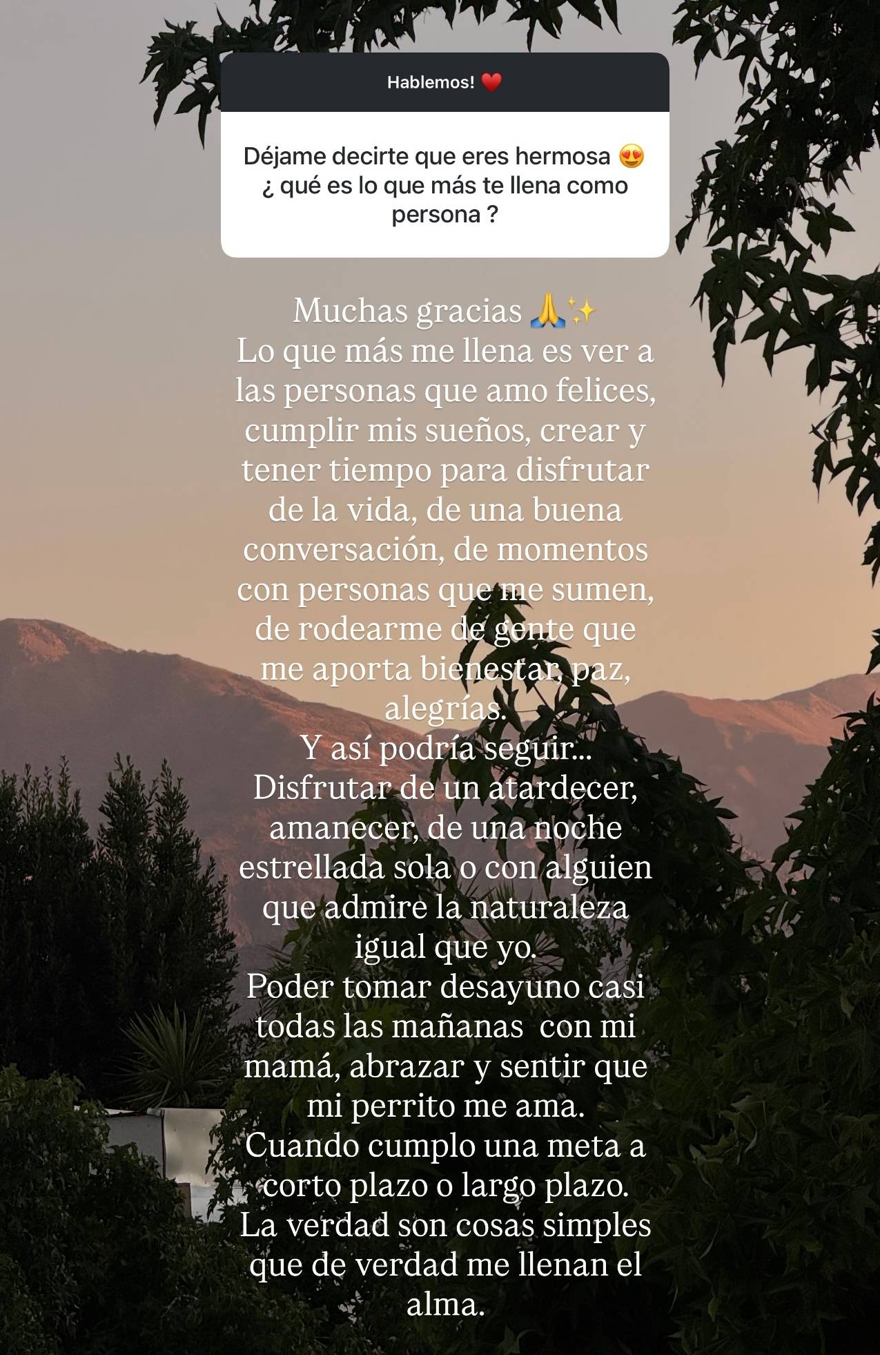Cata Vallejos publicó en sus historias de Instagram algunas de las inquietudes que le plantearon sus fans durante una dinámica de preguntas y respuestas. "Déjame decirte que eres hermosa. ¿Qué es lo que más te llena como persona?", escribió un internauta.