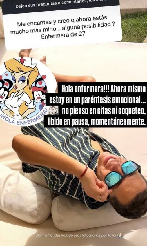"¡Hola, enfermera! Ahora mismo estoy en un paréntesis emocional... No pienso en citas ni coqueteo, libido en pausa, momentáneamente", respondió y lejos de quedarse ahí, Lucero pidió "no me mandes más de esas fotografías, por favor".