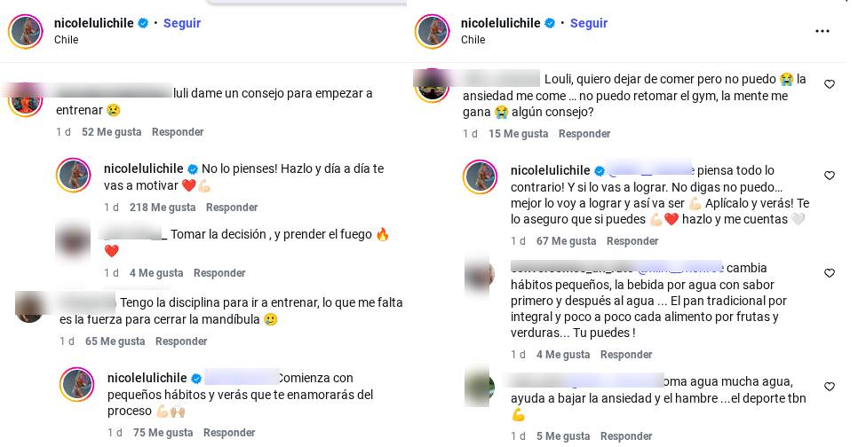 "Tengo la disciplina para ir a entrenar, lo que me falta es la fuerza para cerrar la mandíbula", comentó una internauta. "Comienza con pequeños hábitos y verás que te enamorarás del proceso", respondió Moreno.