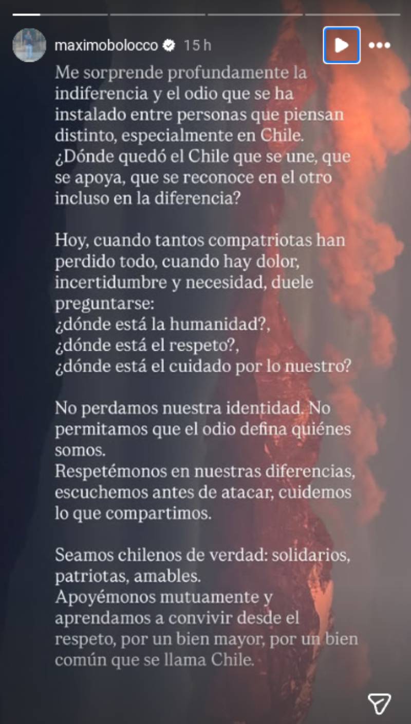Como muchos otros famosos, Máximo Menem Bolocco aprovecha el alcance de sus redes sociales para difundir información en pro de los damnificados por los incendios en las regiones del Biobío y Ñuble.
