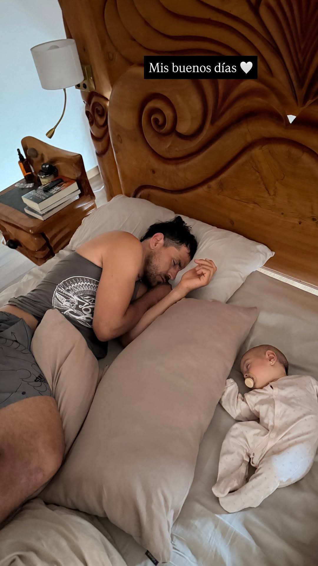 En esta ocasión Meli Noto publicó en sus historias de Instagram una imagen que evidencia la conexión entre padre e hija. La presentadora captó a Pangal profundamente dormido, con su guagua de tres meses también dormida plácidamente, al otro lado de la cama y separada de él por unos almohadones.