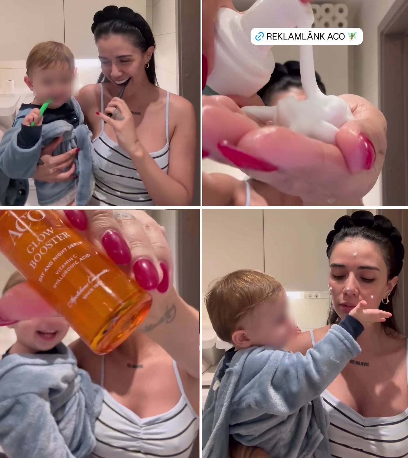 Steffi publicó en sus historias una publicidad de una marca de cosméticos de Suecia. La hija de DJ Méndez se grabó mientras hacía su rutina diaria de skincare, con el niño de casi dos años en brazos.