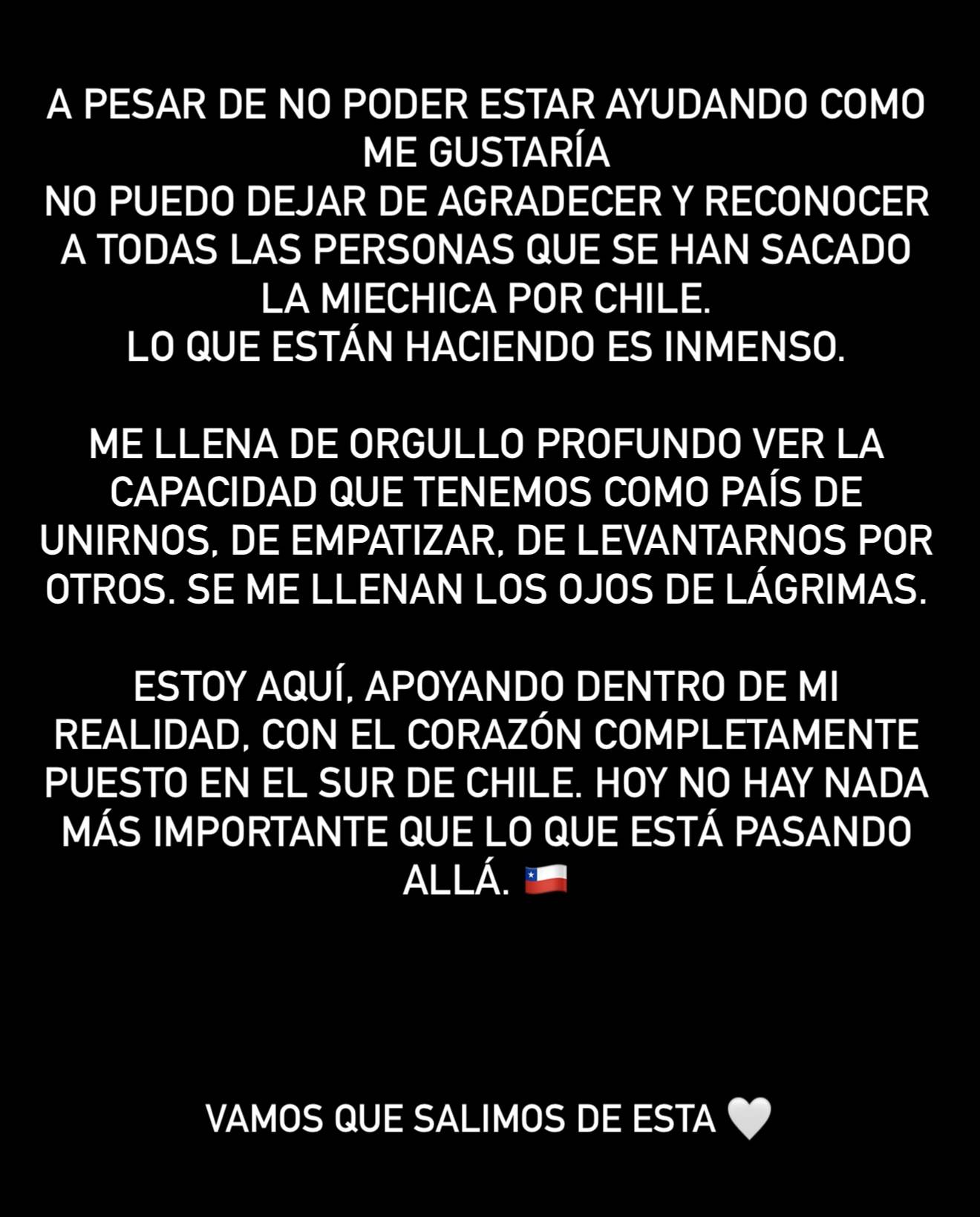 "Estoy aquí, apoyando dentro de mi realidad, con el corazón completamente puesto en el sur de Chile", dijo en una siguiente historia, donde recalcó que, por su estado, no le es posible ayudar cómo le gustaría.