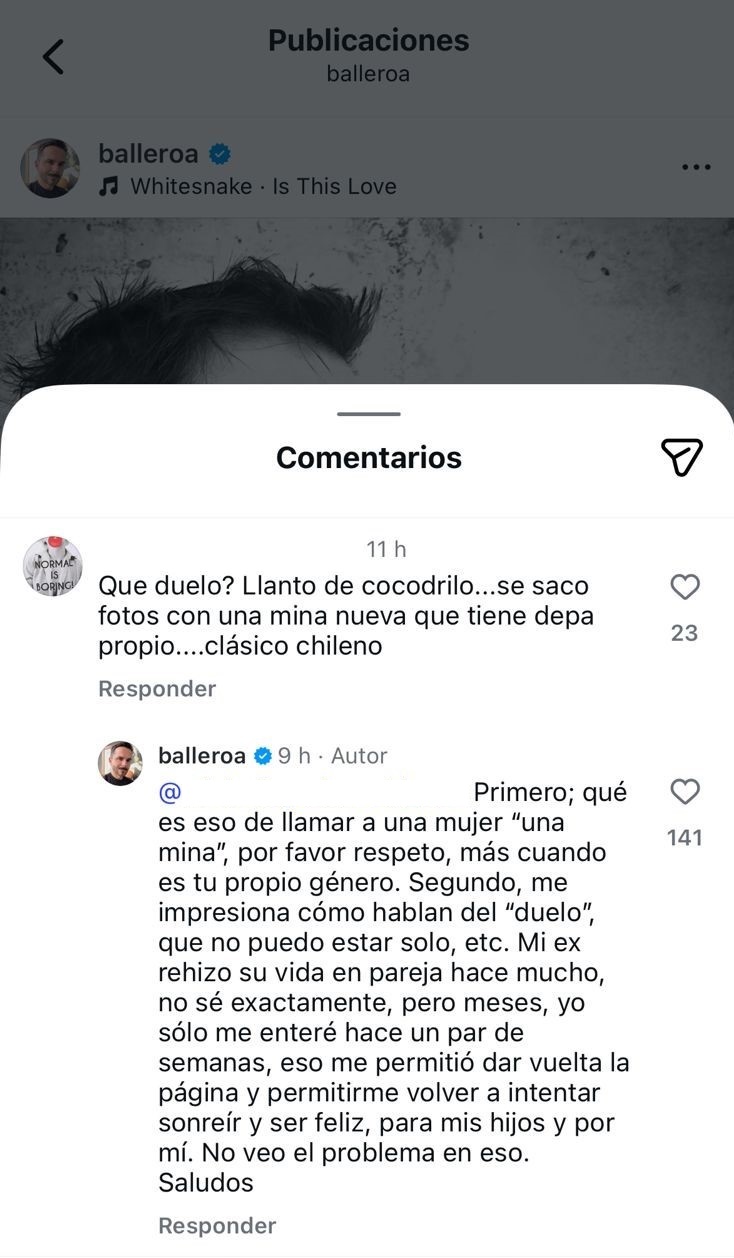 Precisamente, en su última fotografía en su cuenta de Instagram, una seguidora comentó: "¿Qué duelo? Llanto de cocodrilo... se sacó fotos con una mina nueva que tiene depa propio... Clásico chileno".