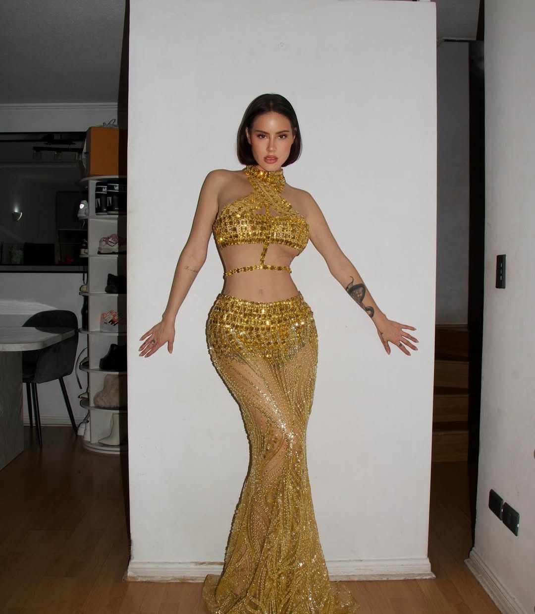 La parte superior está compuesta por un top de pedrería de cuello halter que deja al descubierto sus hombros y gran parte de su abdomen y espalda, una apuesta sensual que resalta su figura al máximo.