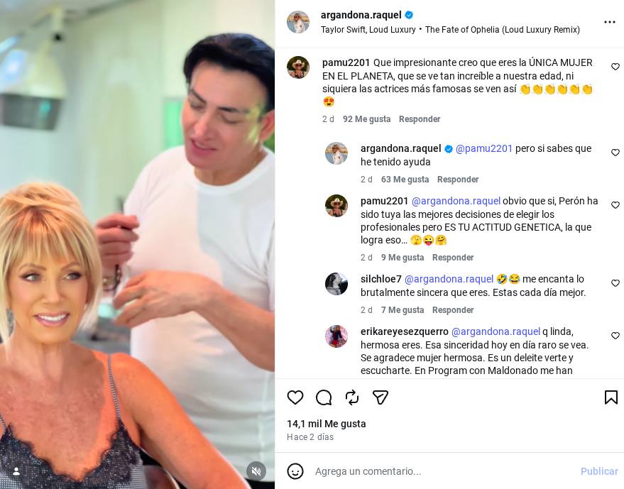 Ir a la siguiente nota"Pero sí sabes que he tenido ayuda", replicó Argandoña, fiel a su sentido del humor y seguramente en referencia a los retoques y tratamientos estéticos.