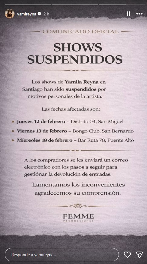 "Los shows de Yamila Reyna en Santiago han sido suspendidos por motivos personales de la artista", aparece en el mensaje compartido.
