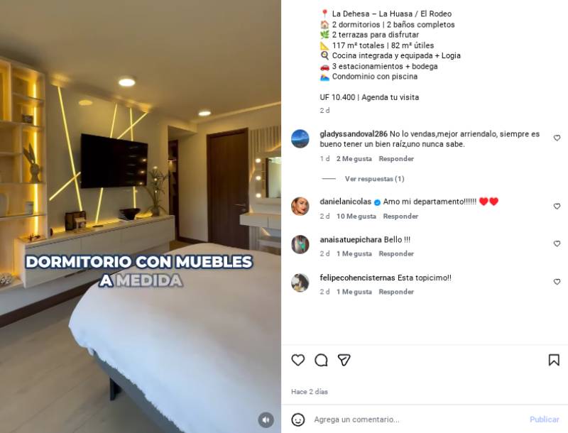 "¡Amo mi departamento!", escribió Daniela Nicolás en la publicación de la compañía que gestiona la venta del inmueble, un sitio totalmente amoblado con una decoración elegante y moderna, donde el dormitorio principal es el espacio estrella.
