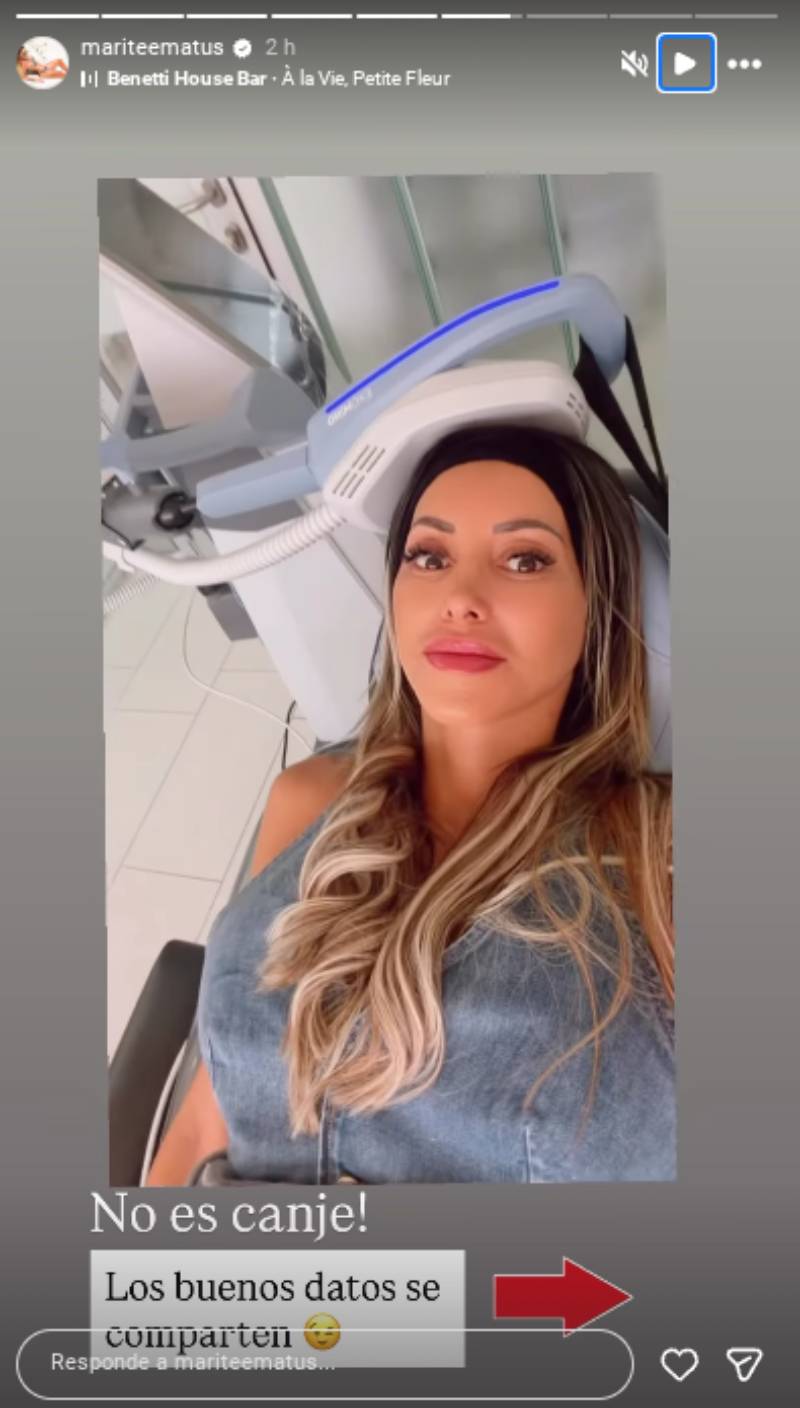 Marité publicó en sus historias de Instagram un video donde se la ve recostada en una camilla de un centro de medicina estética, antes de recibir una terapia que recomendó a sus seguidores.