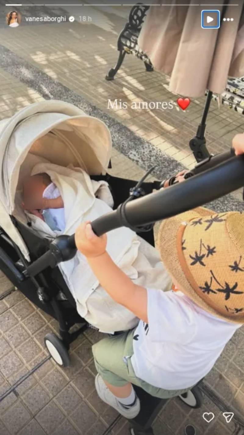 Vanesa estuvo compartiendo en sus redes sociales algunas imágenes de sus hijos durante un paseo. En una de las postales, Teo aparece vestido con polera blanca y sombrero, mientras empuja el coche de Alma. "Mis amores", escribió la modelo sobre la imagen, donde se ve a su hija dormir plácidamente.