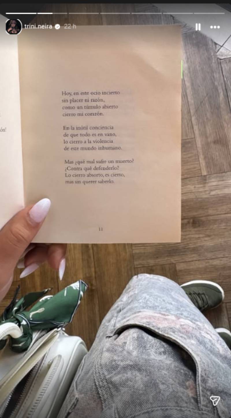 Trini Neira publicó en sus historias una fotografía en la que sostiene un libro de poemas y enfoca una página con versos que reflejan el deseo de aislarse y preferir estar como "muerto" para no sentir nada, ni sufrir.